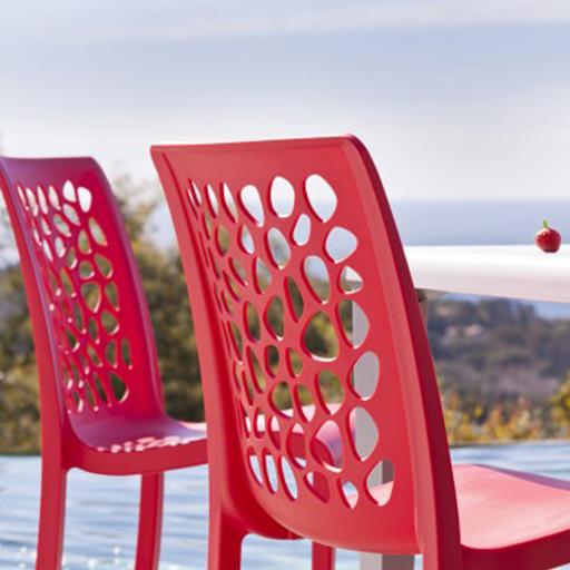 ¡Juegue la carta de la originalidad para su salón de jardín! Formas circulares sobre el respaldo de la silla que aportan un aspecto de ligereza